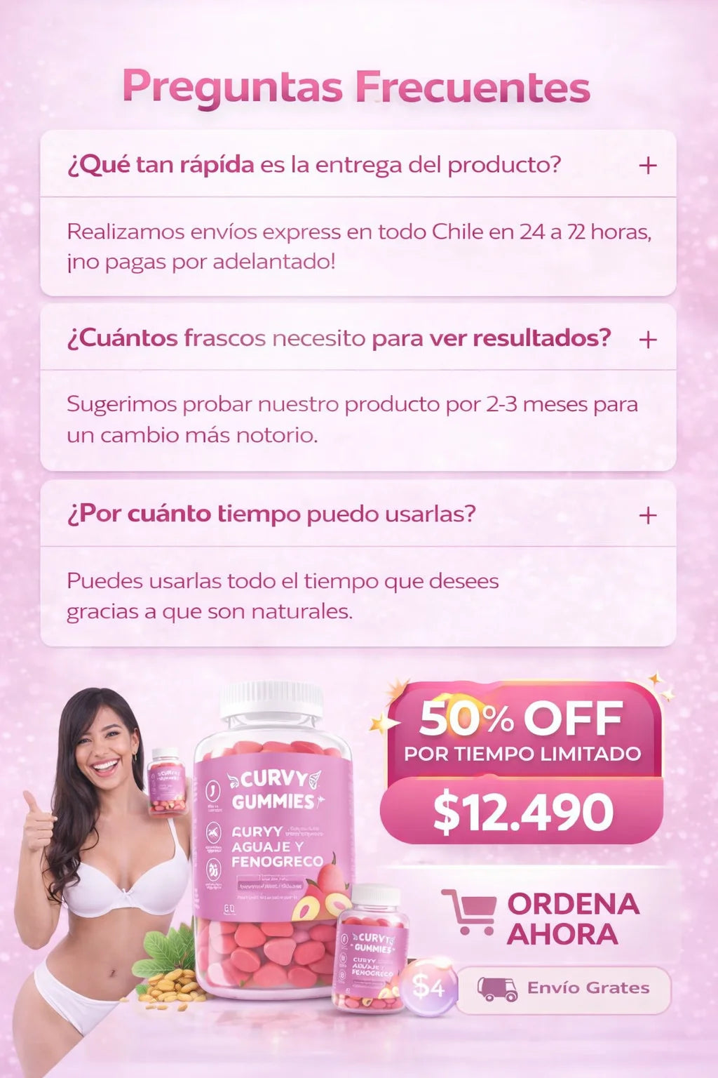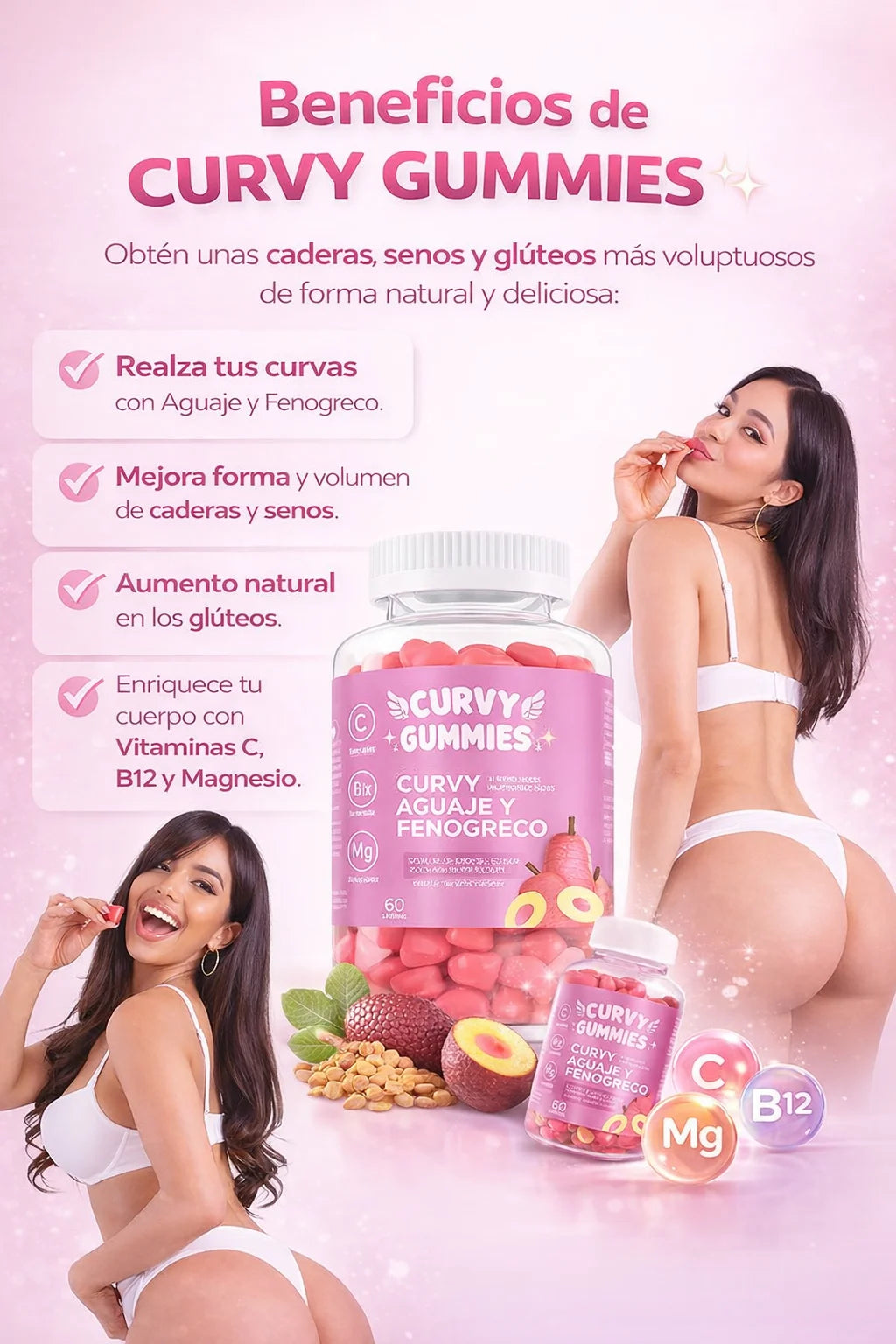 Deliciosas gomitas con aguaje y fenogreco que ayudan a realzar caderas, senos y glúteos, mientras nutren tu cuerpo con vitaminas C, B12 y magnesio.
