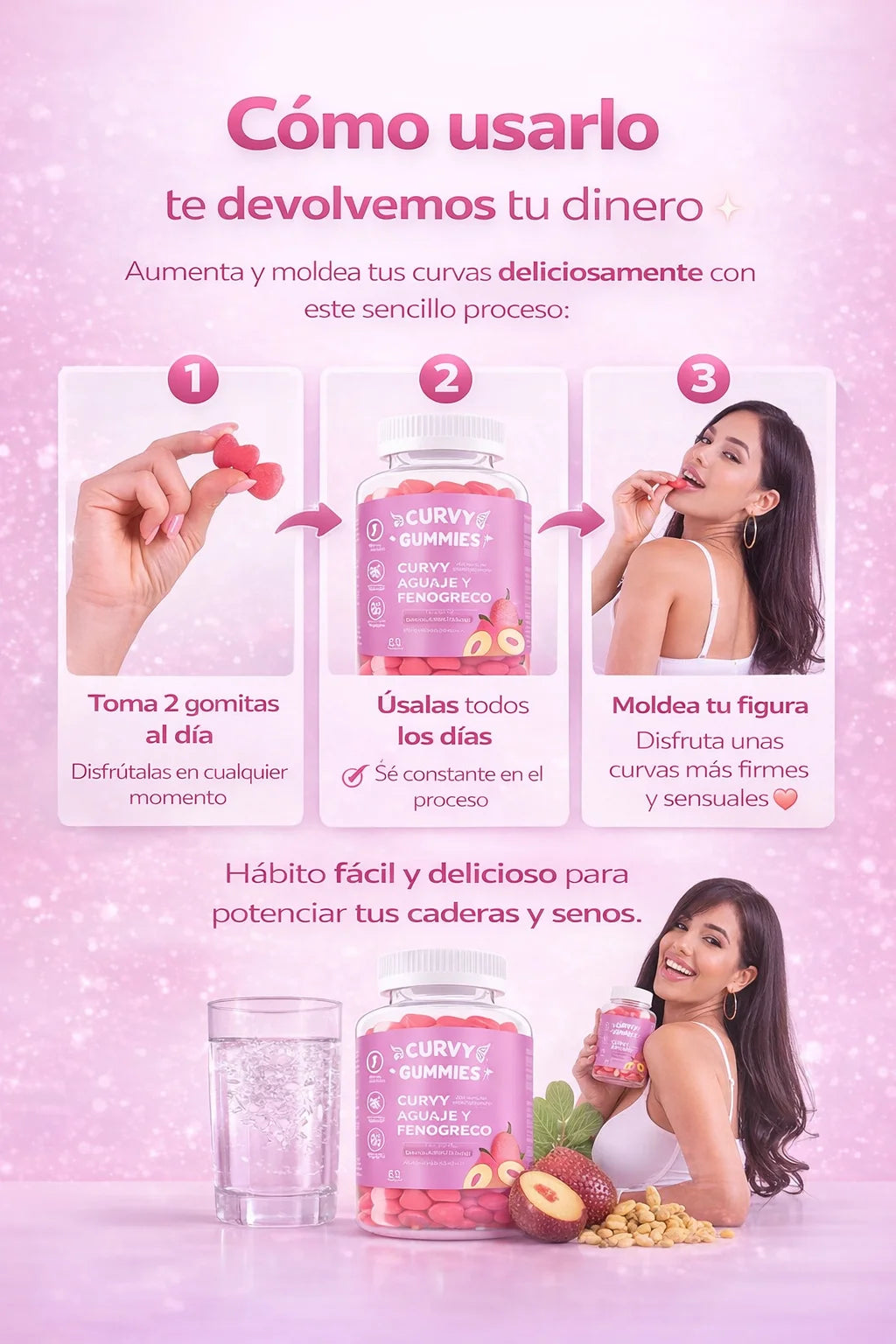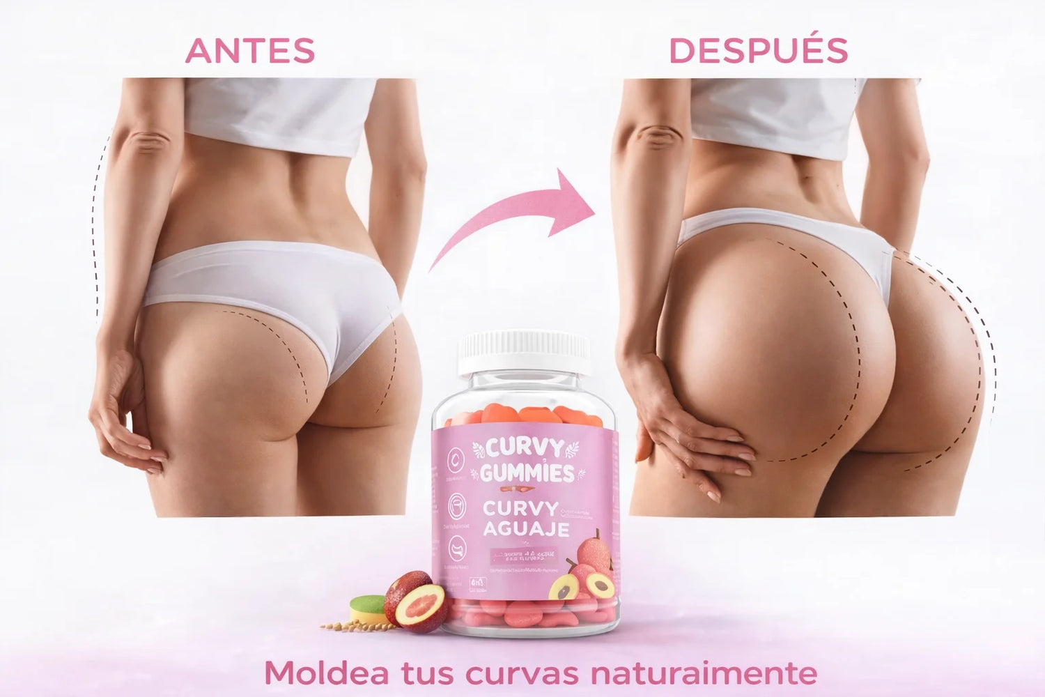 Toma 2 gomitas al día y consúmelas de forma constante para apoyar el moldeado natural de tus curvas. Un hábito delicioso que acompaña tu día a día mientras realzas tu figura de manera gradual y natural.
